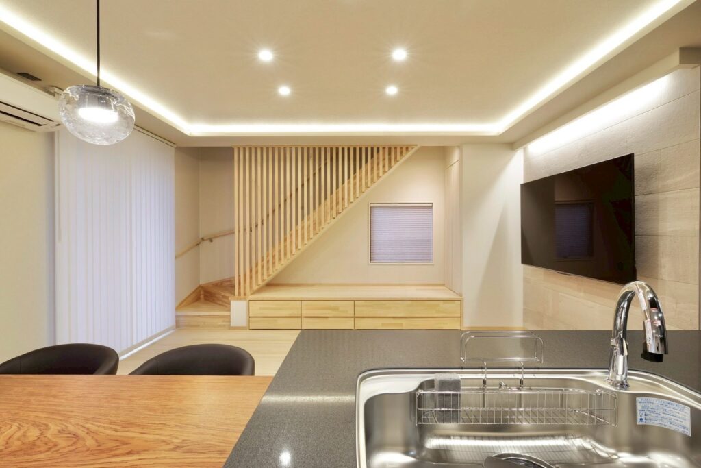 洗濯〜収納までの動線を短縮しています。💡内装のこだわり 細部までこだわりを詰め込んだ内装。 ・ドライヤーニッチやキーニッチなど、便利なニッチを各所に配置 ・テレビ背面のニッチで配線も隠れてスッキリ ・アクセントクロスが映える空間に さらに、リビングは折り上げ天井にし、テレビ上部には間接照明を採用。 デザイン性と落ち着きを両立した空間に仕上がりました。