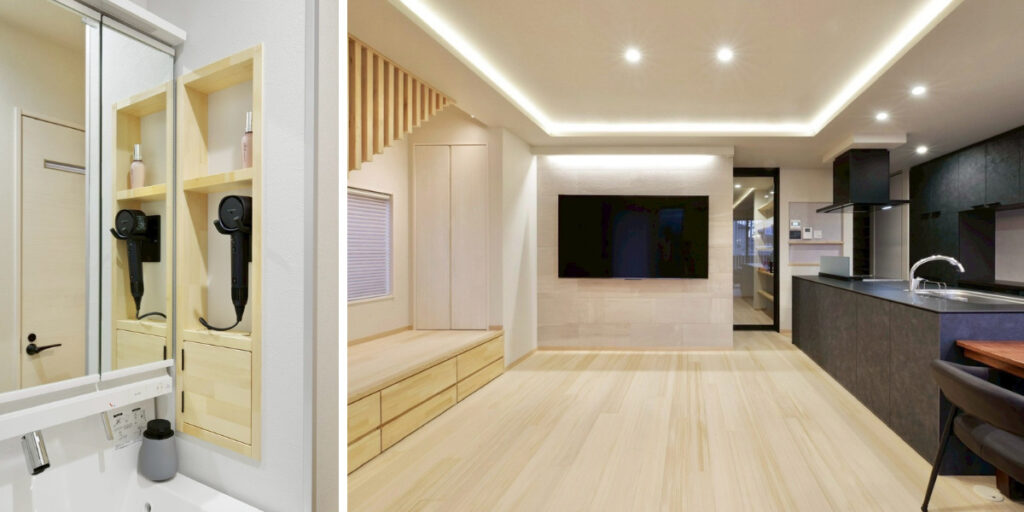 洗濯〜収納までの動線を短縮しています。💡内装のこだわり 細部までこだわりを詰め込んだ内装。 ・ドライヤーニッチやキーニッチなど、便利なニッチを各所に配置 ・テレビ背面のニッチで配線も隠れてスッキリ ・アクセントクロスが映える空間に さらに、リビングは折り上げ天井にし、テレビ上部には間接照明を採用。 デザイン性と落ち着きを両立した空間に仕上がりました。