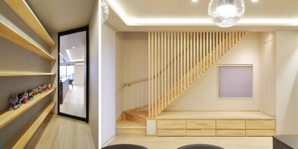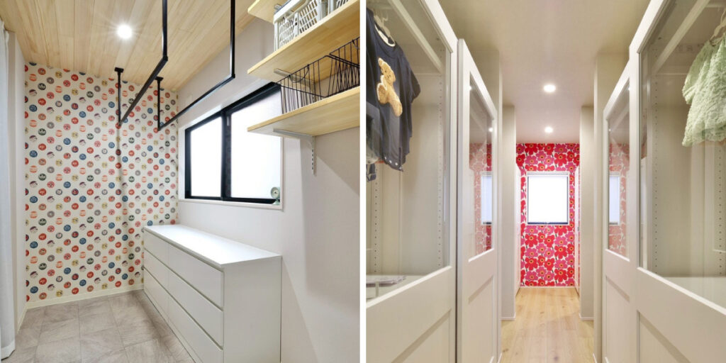 しっかりと収納量を確保しています。 また、一階の床にはもみの木を使用し、脱衣室の天井にも採用。 部屋干し時の調湿・消臭効果も期待でき、
